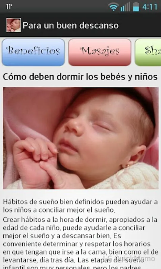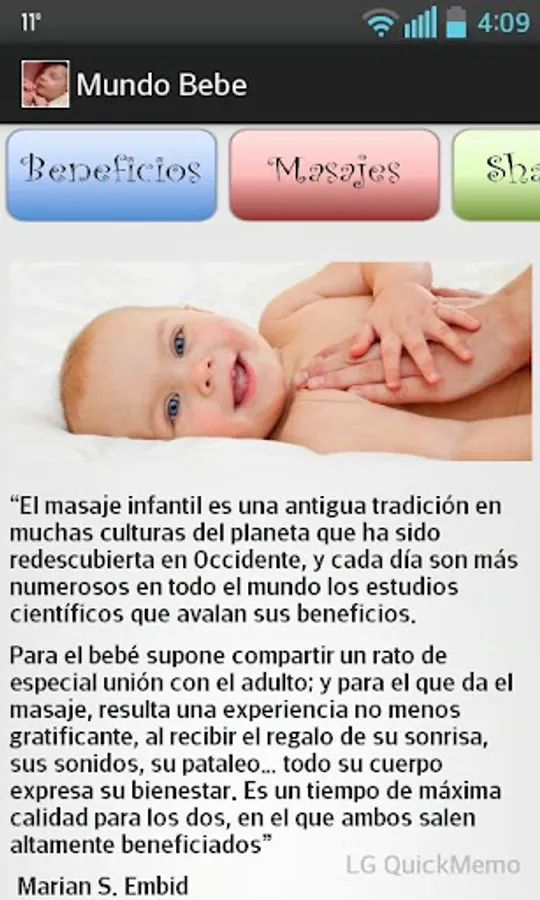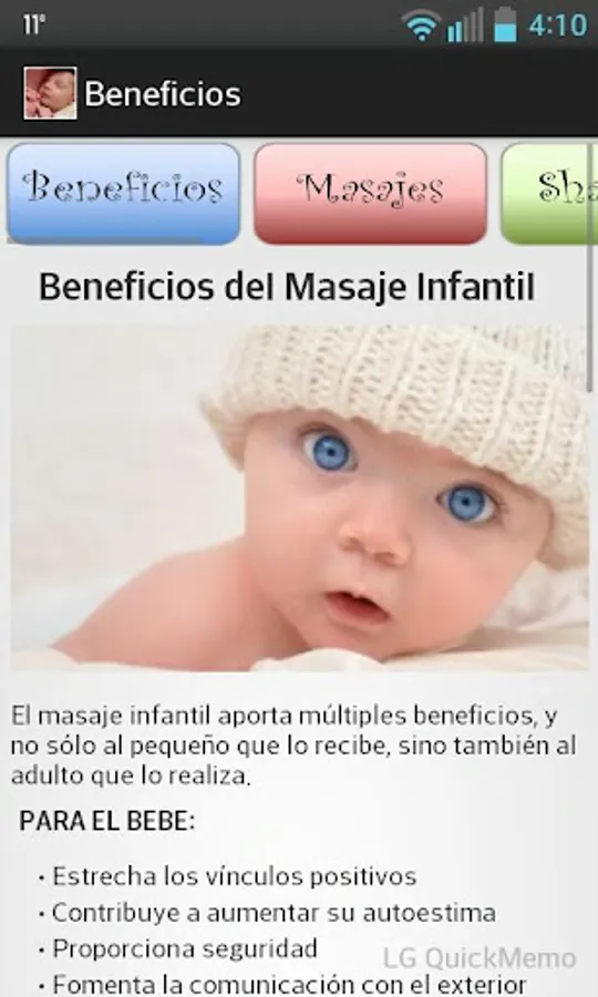 In this application you will find tips and information to help you learn to know your baby and go month to month growth and development. Also find tutorials explained step by step, so we can issue your baby massage for both relaxation as well as to soothe their ailments. Strengthening and increasingly narrowing your bond with.