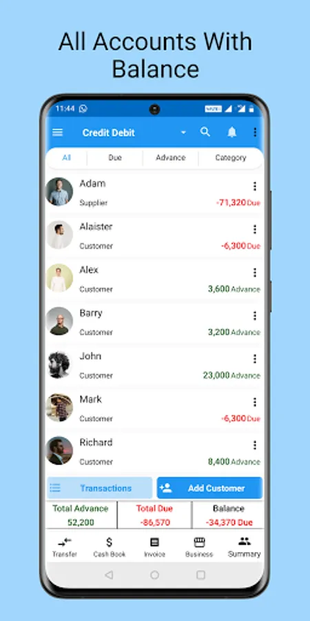 Credit Debit - ledger account book is a easy to use app that helps you manage your business finances and keep track of your customers' credit and debit accounts. With this app, you can easily create and manage customer accounts, record transactions, send payment reminders, and generate reports.