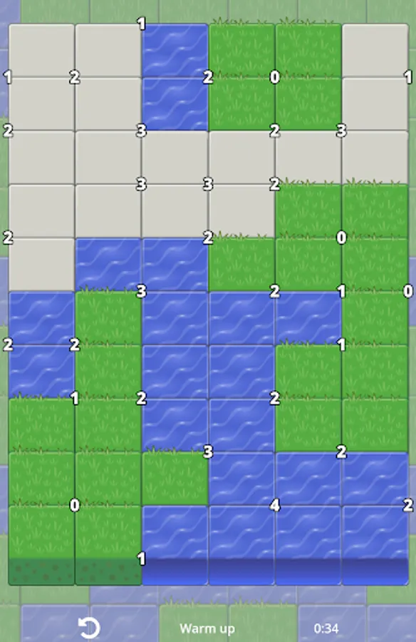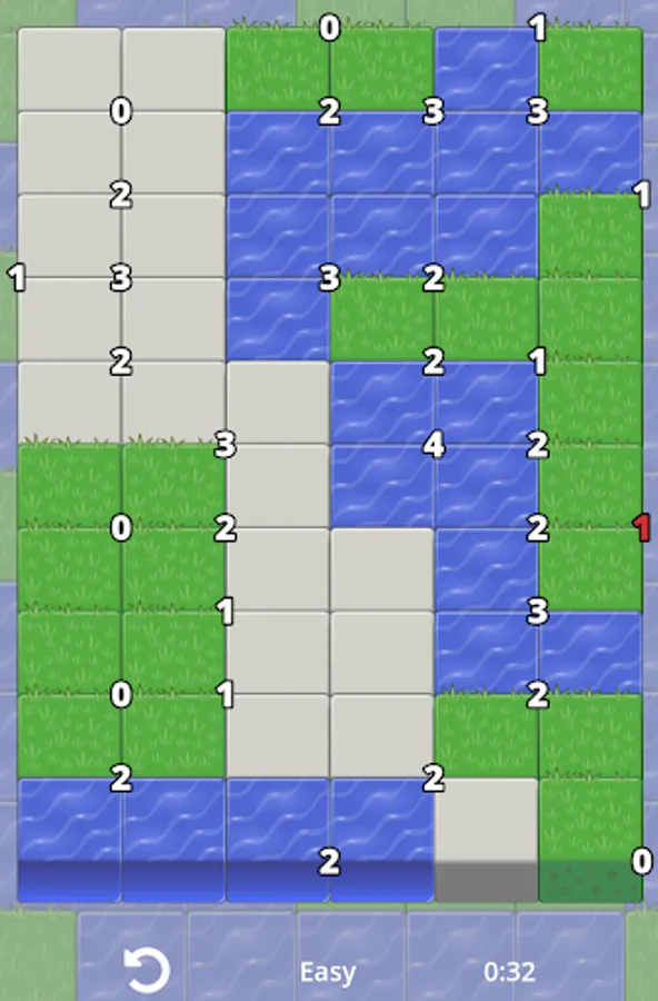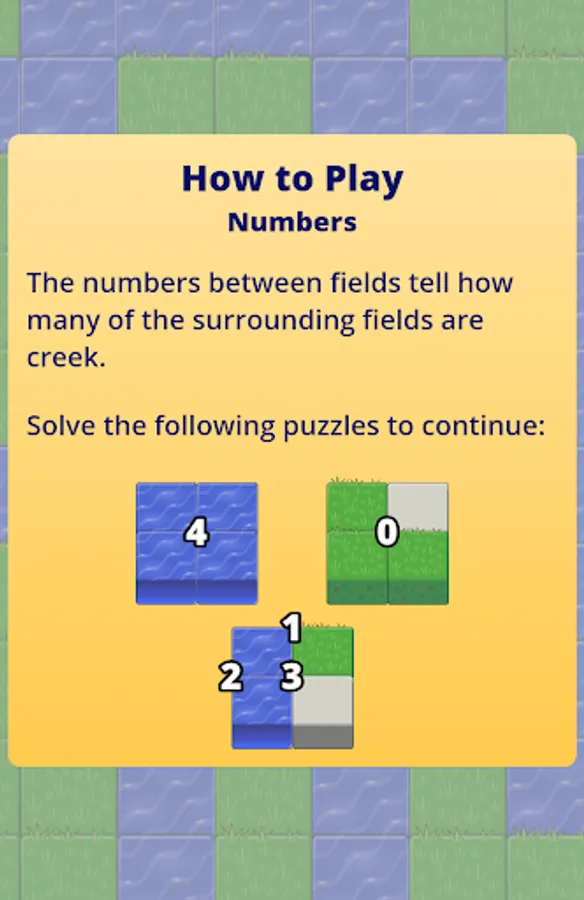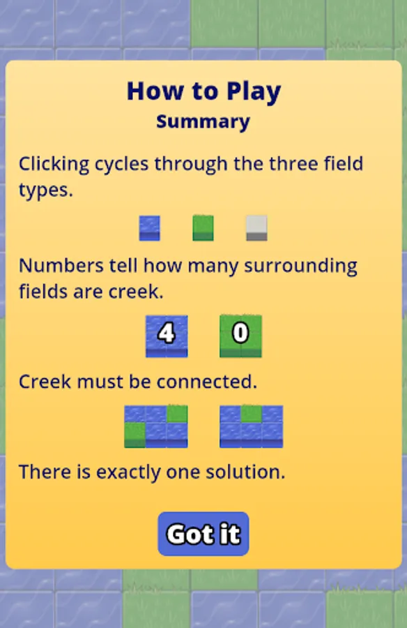 You have to mark each field as either creek (blue) or grass (green) according to the following rules: