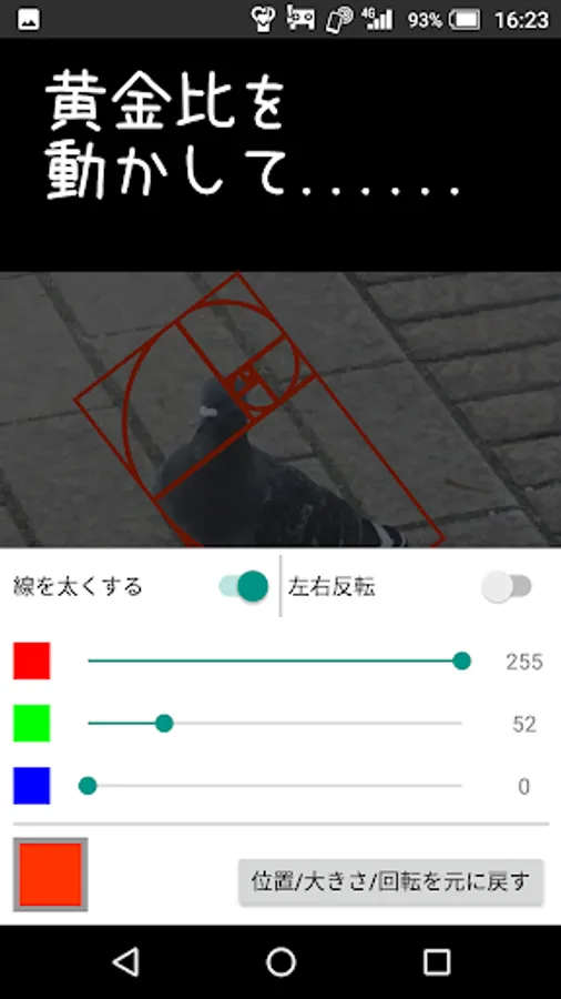 貼り付ける黄金比は自由に移動・回転・拡大縮小させられる他、オプションで線の太く・左右反転・色の変更を行うことができます。