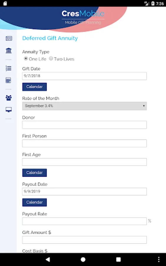 Run calculations for a charitable gift annuity, deferred gift annuity, charitable remainder unitrust, annuity trust or lead trust. Just enter your donor information and view the answers anytime, anywhere.
