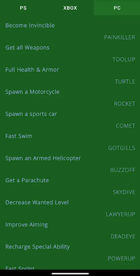 This application provides a quick and easy guide to accessing unlimited money, weapons, ammo, vehicles, and more on Playstation, XBOX, P.C, etc. Now you don't need to explore the map to find a weaponry, parachute, planes or cars, and immortality mode will open up fun adventures with cops;)