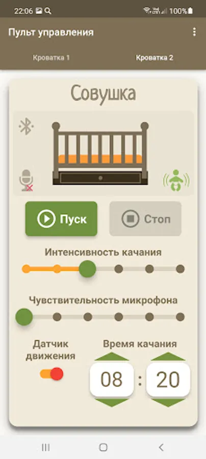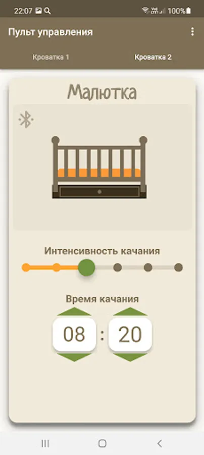 Virtual remote control of the device for rocking the bed for the models "Baby", "Good", "Quiet", "Sovushka". Only works with new Bluetooth LE based devices.