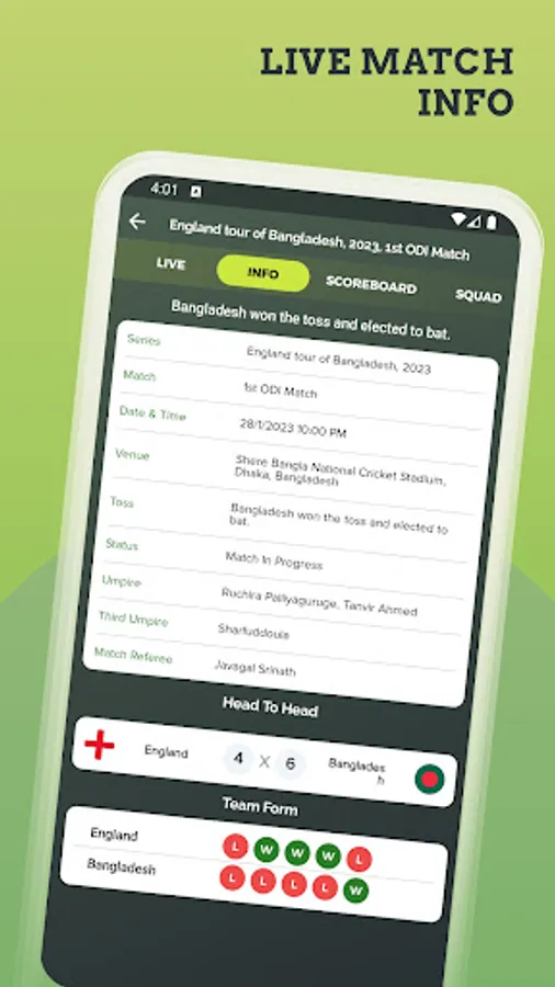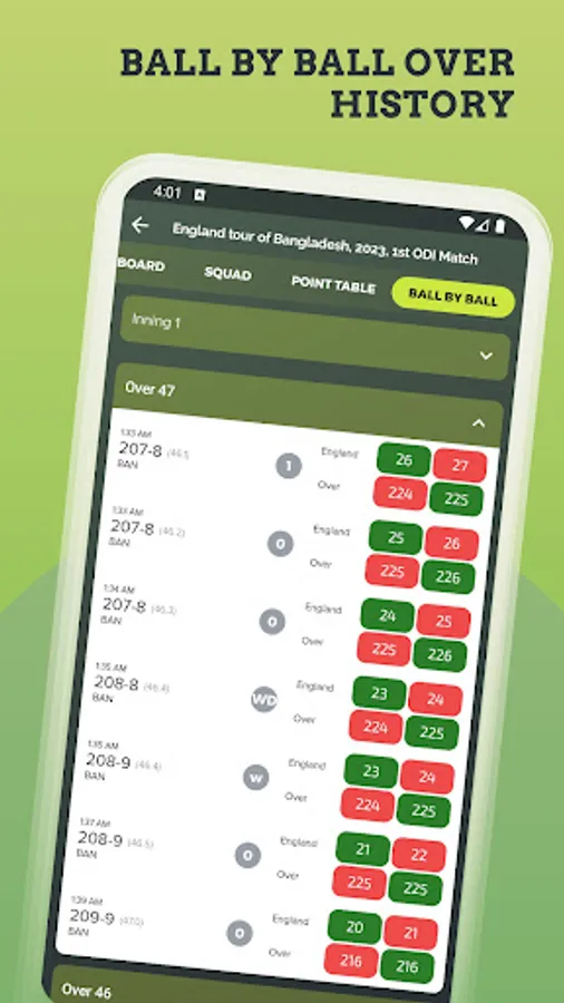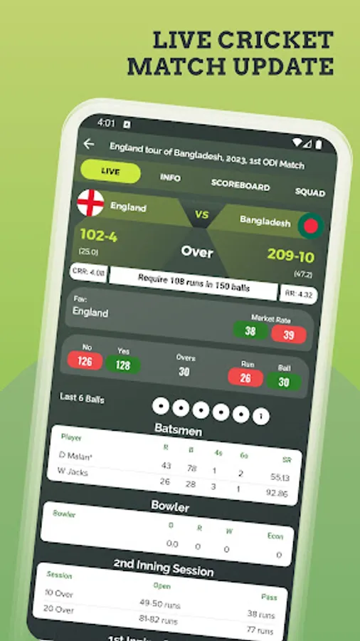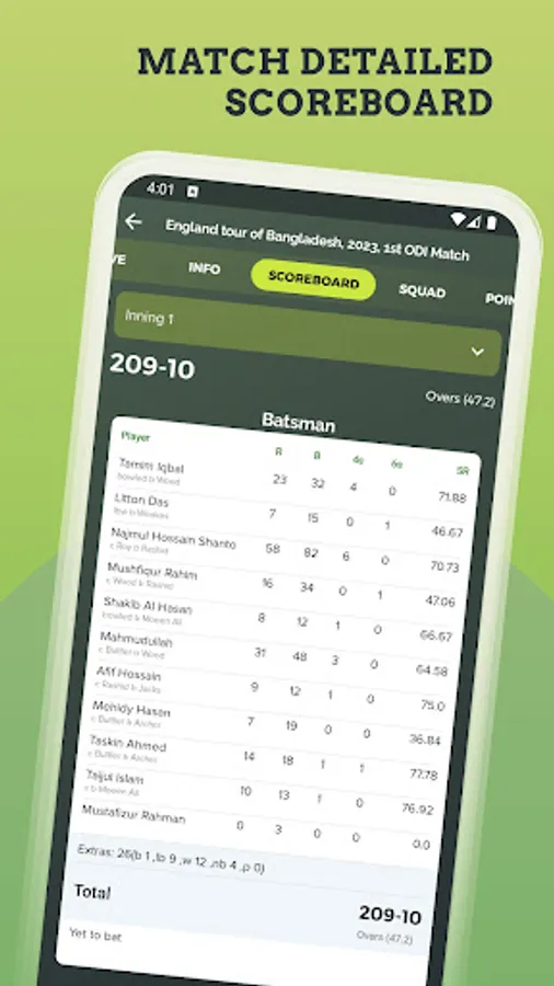 Get detailed cricket score board 📊 with for both team's where you get details of a batsman, bowling, fall of wicket, partnership with auto-refresh. Also catch finished match details with a fast cricket live line.
