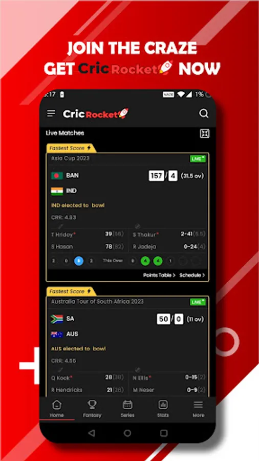 π Cric Rocket: Live Line Cricket Scoresβ Serving Ultimate Cricket Fans with the fastest scores with Live Line Cricket match coverage, ball-by-ball cricket commentary, for India vs Australia, ICC Cricket World Cup 2023 and other cricket tournaments.