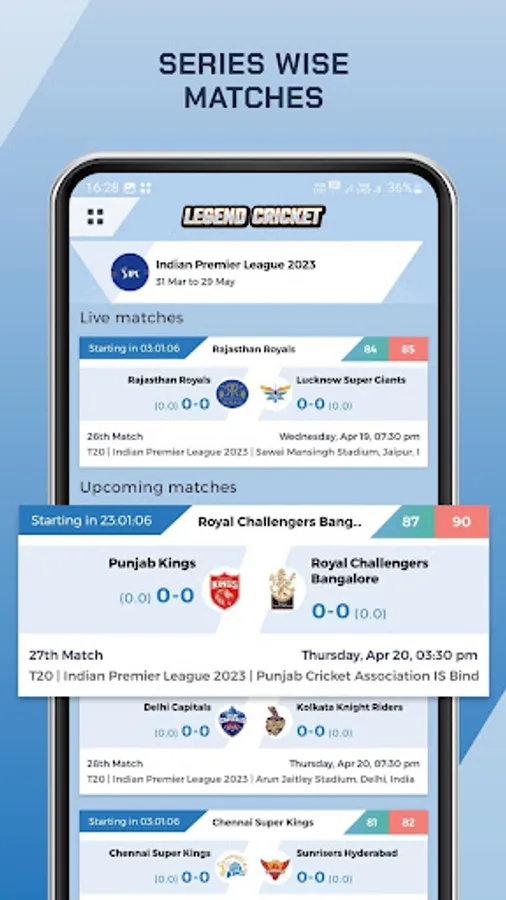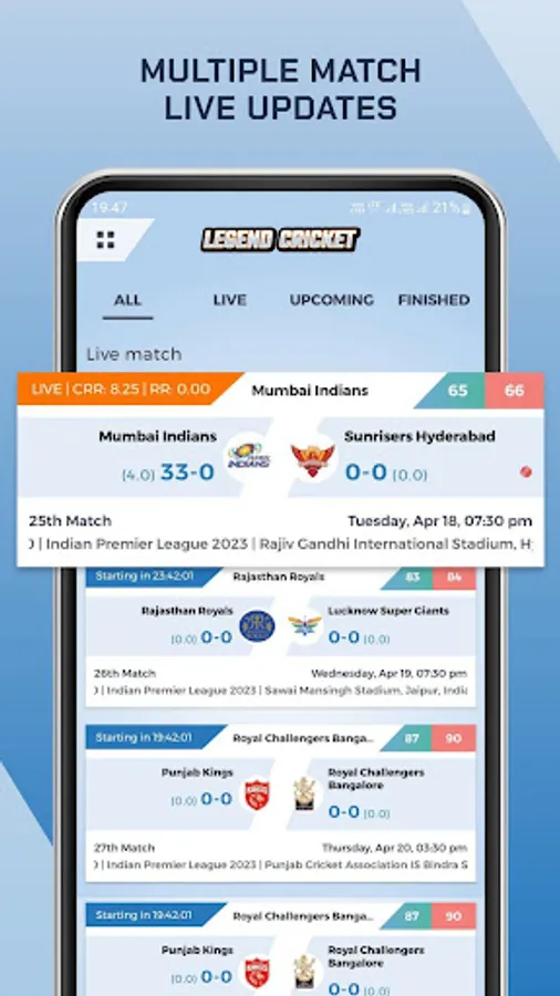 Legend Cricket Live Line shows live cricket scores of all the international and domestic cricket season series, T20 series, ODI, and other matches. We also provide a live cricket scorecard to get complete detail of players' run, wicket, and point table. Enjoy live cricket match score with