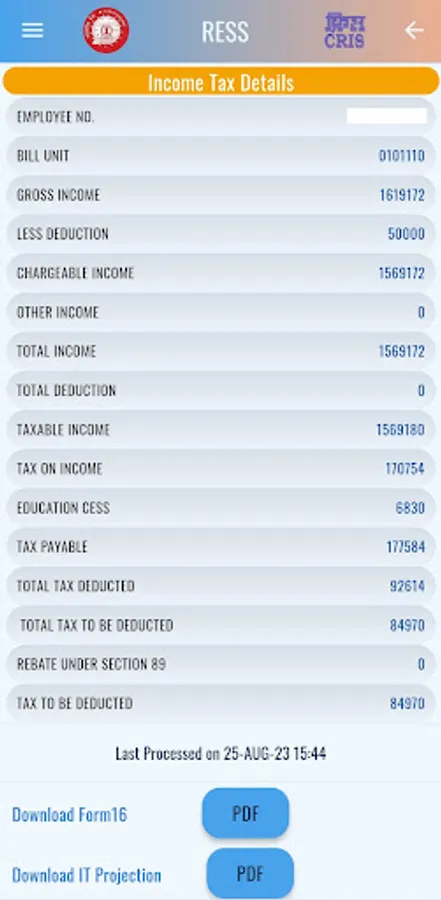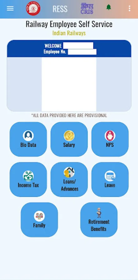 Railway Employee Self Service (RESS) – An online system for Indian Railway employees (Staff and Officers) has been developed by Centre for Railway Information Systems (CRIS). Now Railway employees can use this application to view their Personal Bio-data, Service and Pay related particular, Salary details, Provident fund/NPS details ,Salary related loans & advances, income tax details (including monthly deductible amount) ,Leave and Family details, Pension Benefits (for retired employee only) etc. Download of Payslip in PDF format is also available.