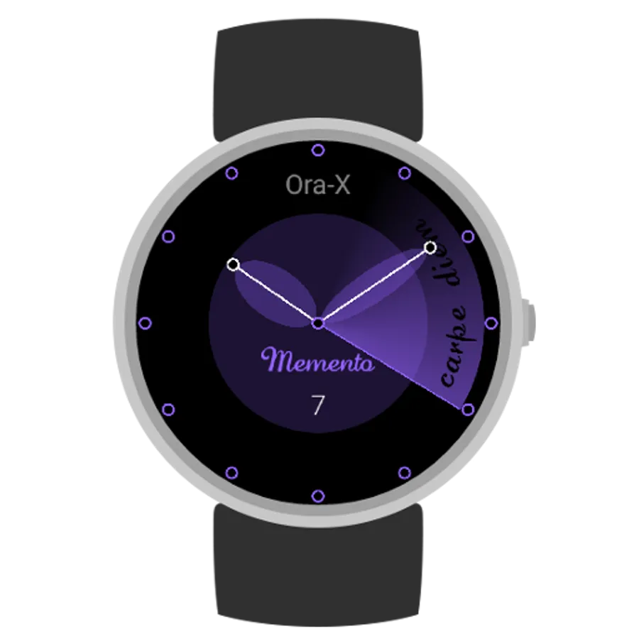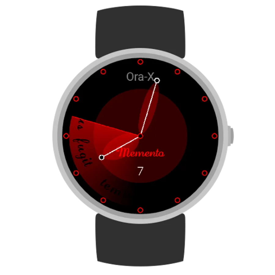 Ora-X Memento (Remember in latin) is the latest Ora-X creation, a minimalistic design created 100% in WatchMaker, that mix colors, shadows and a radar second hand that uncovers two latin phrases, Tempus Fugit (Time Flies) and Carpe Diem (Seize The Day). Tap the centre of the dial to choose from 8 beautiful color schemes. An elegant battery indicator is also provided, under 25% the hands become orange (under 15% red) and the circle at the end of each hand slowly fall to the center. Hour hand indicates smartwatch battery level, minute hand is for the phone.
