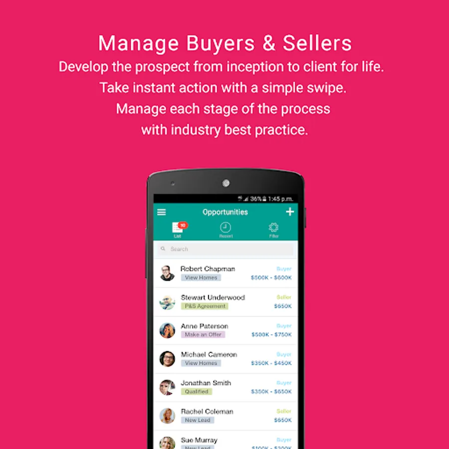 -Easily add and manage all your Buyers and Sellers from a New Lead stage to Closing.