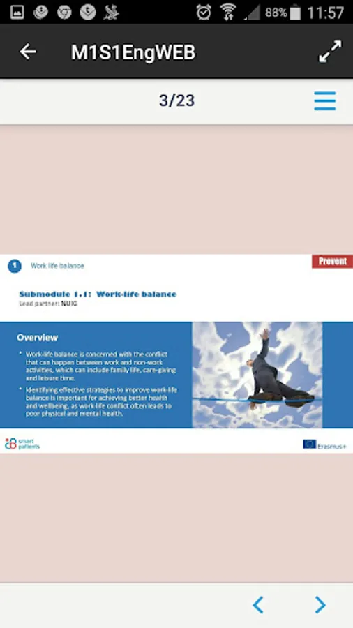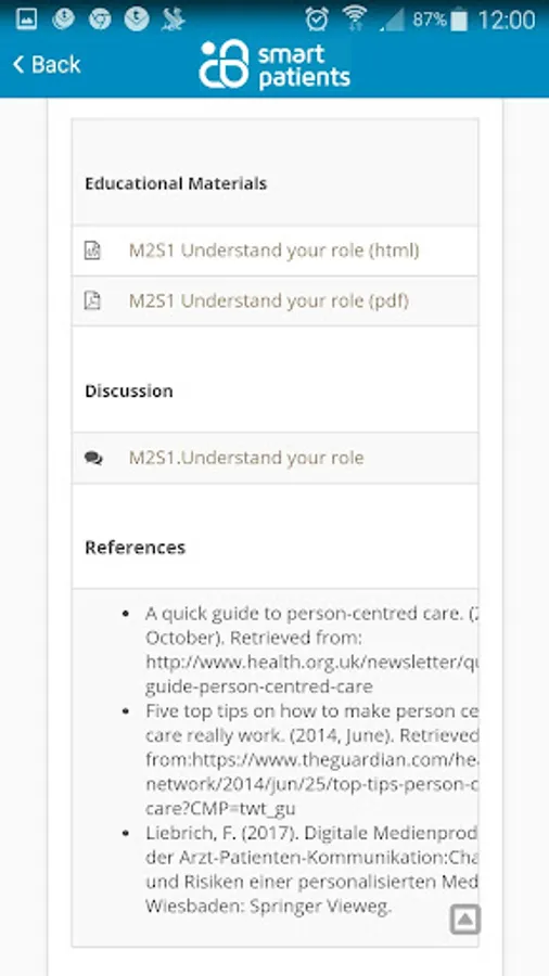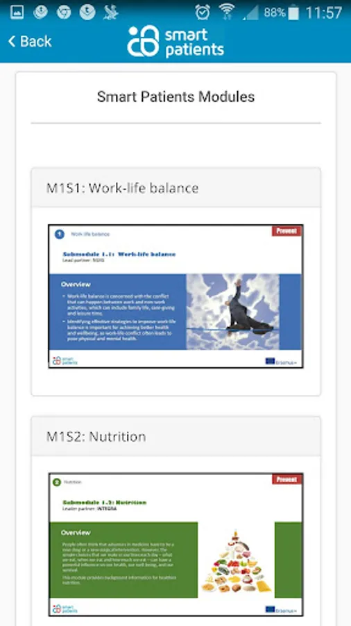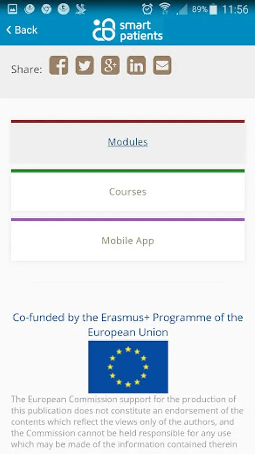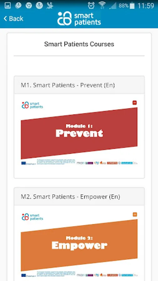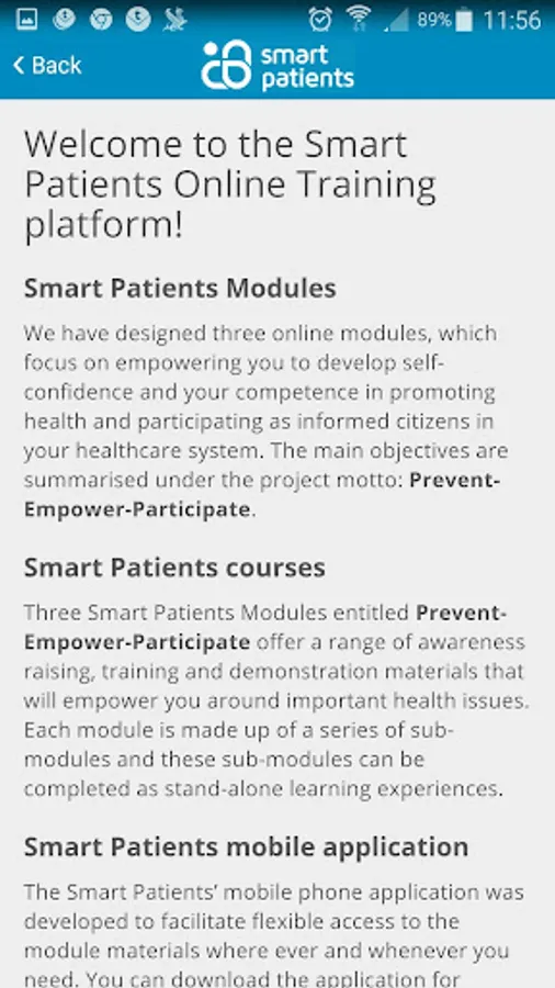 The Smart Patients Mobile Application is a fully functional training environment that provides access to all project's outputs, online Modules and Courses.