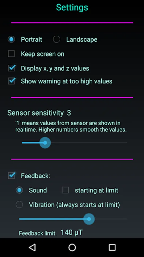 VIBRATION: You can choose to get a vibrating feedback if the magnetic field reaches a certain value.