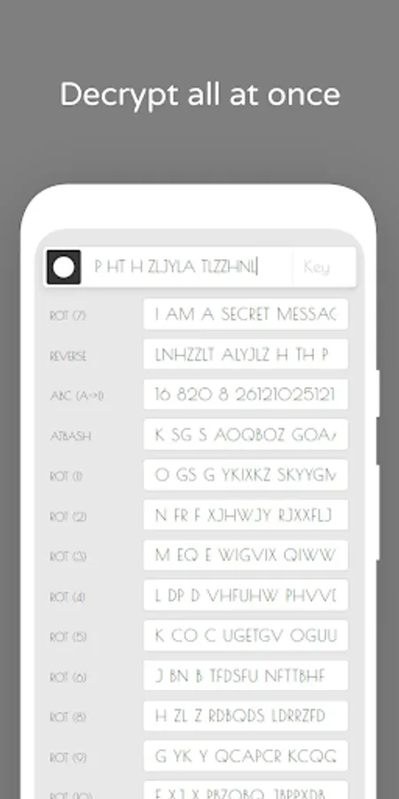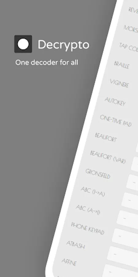 Decrypt secret messages in no time with Decrypto app! Your encrypted messages have no chance of being secret anymore. Decrypto uses over 90 different decryption techniques all at once and go trough each one of them with the most likely decryptions brought to the front. You don't need to know the specific cipher anymore! And it's totally free to use!