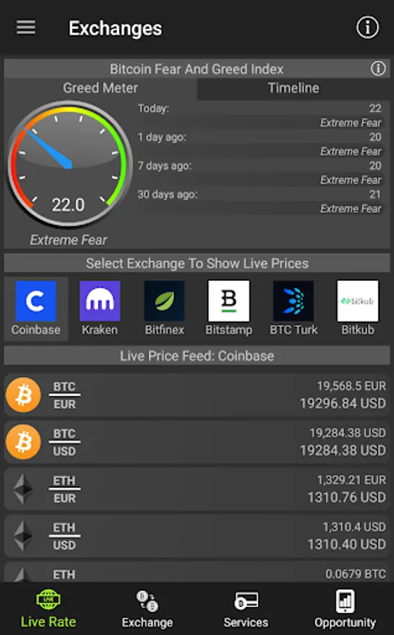 - live price from selected exchanges, market sentiment tracking (fear and greed index)