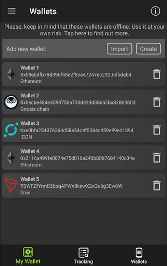 - cryptocurrency offline wallets, currently support: Ethereum ETH, Binance Smart Chain BSC, Ethereum Classic ETC, Icon ICX, Klaytn KLAY, Polygon MATIC, Tron TRX, Gnosis GNO