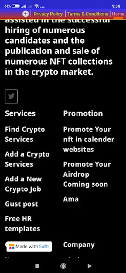 app that connects you with the world of cryptocurrency! Our experienced team of marketers and content creators have a track record of successful candidate placements and NFT collection sales in the crypto market. Our app offers a range of services including finding and adding crypto services and jobs, guest posts, free HR templates, You can even add your NFT collection to our platform. We prioritize your privacy and provide clear terms and conditions, as well as a disclaimer and privacy policy. Contact us for more information or to join our community of crypto enthusiasts!