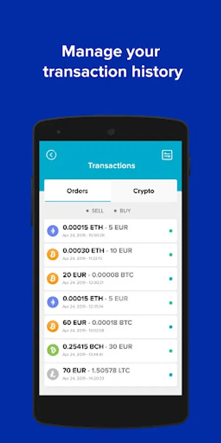 elegro Exchange provides you a safe and secure way to buy and sell cryptocurrency on the go. Using our application, you can easily buy or sell crypto regardless of your location and mobile device. Currently, elegro Exchange supports the 4 most popular cryptocurrencies: Bitcoin, Ethereum, Litecoin and Bitcoin Cash.