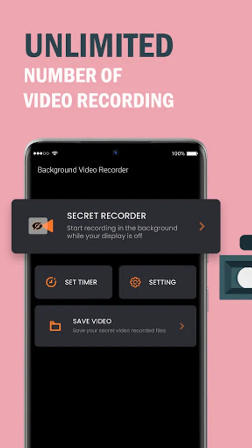 Background Video Recorder app is a Personal camera app that can record video/voice in the background automatic. It helps you to record video by one click easily with the option to enable/disable camera shutter sounds and camera previews. It can continue record video and voice even screen is off and you can scheduled recording on the settings page.