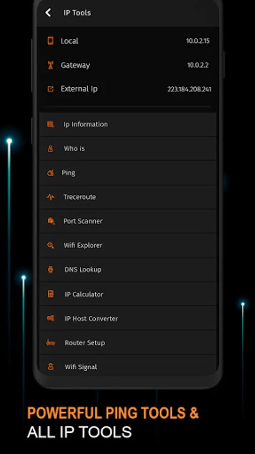 IP Information contains (Internal IP Address, country, local host, frequency, SSID, External IP/Host, MAC, DNS, Gateway, Server Address, Coordinates (latitude-longitude) and Broadcast address etc.)