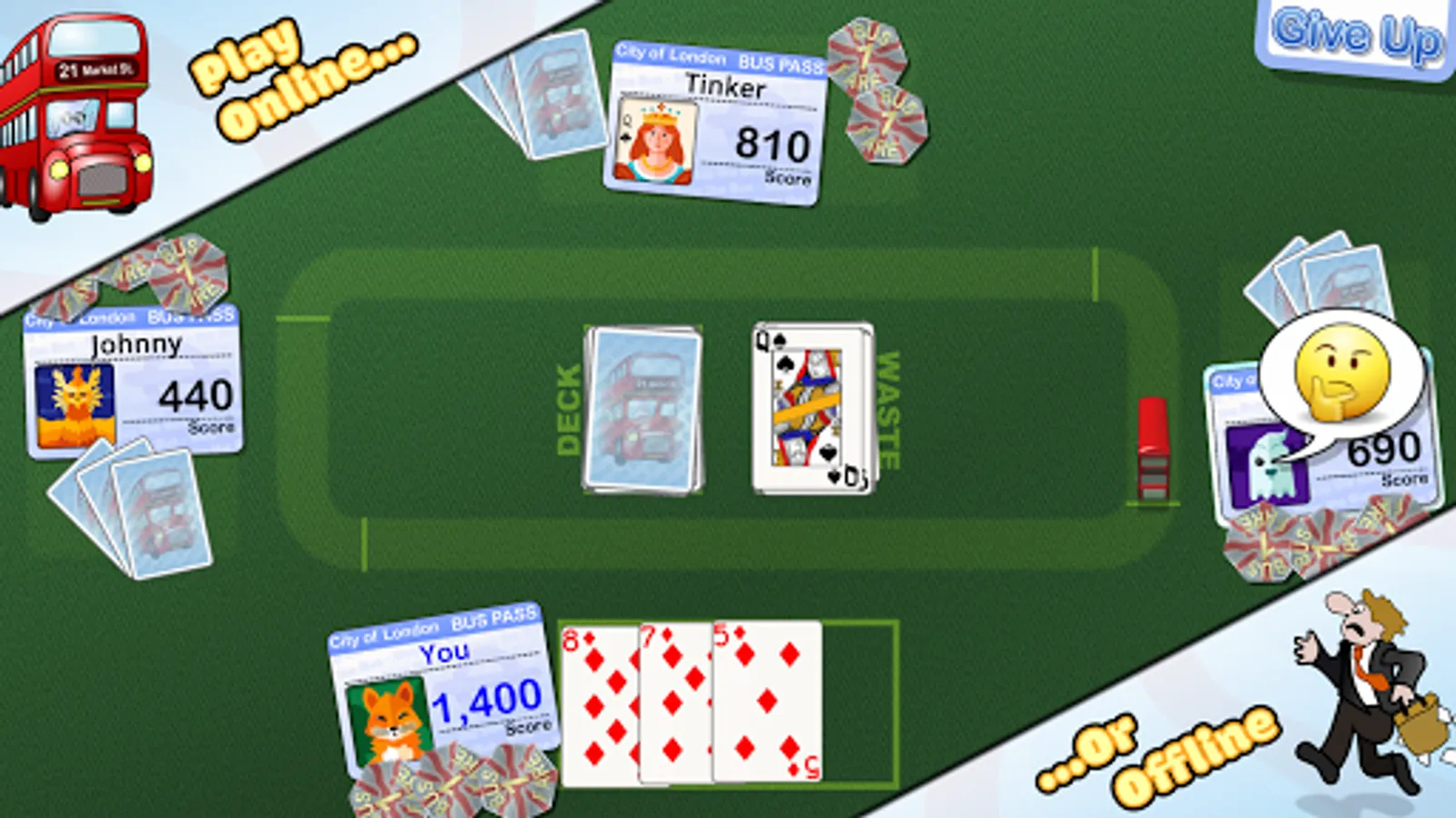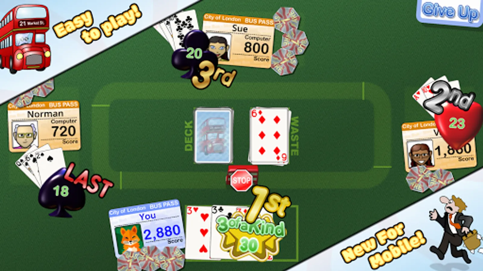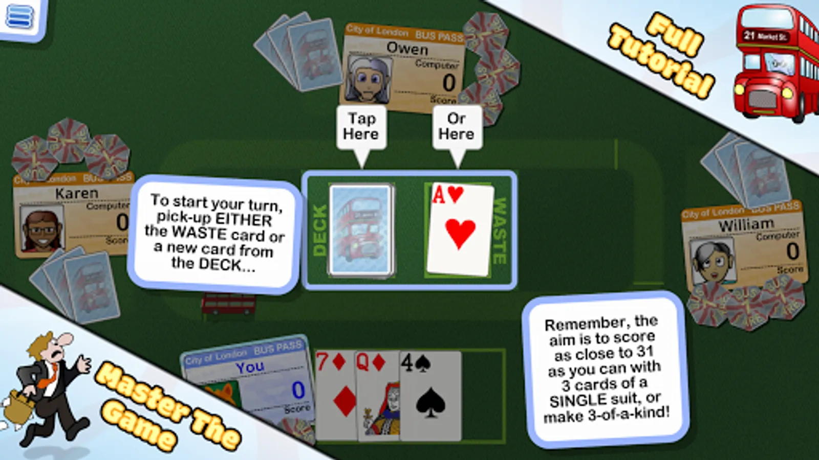 Everyone is dealt three cards then they take turns picking up then discarding a card, aiming to get as close to 31 points - in a single suit - as they can, before stopping the bus. You can also make 3 of a kind for 30 points! Aces are high (11) and picture cards (J Q K) are worth 10.