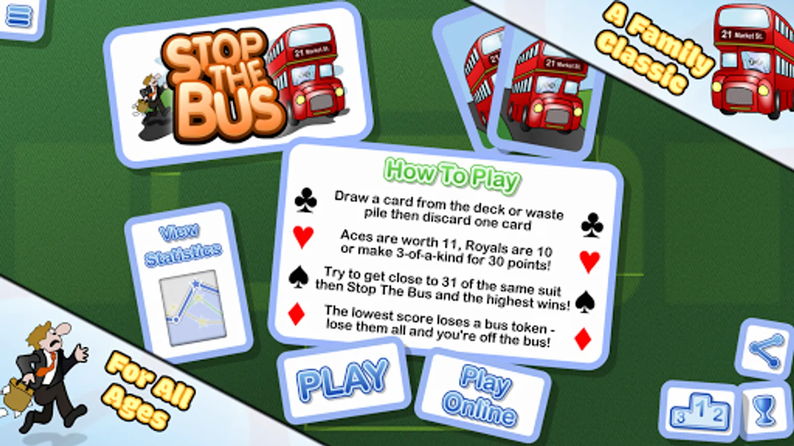Play against the computer, or try the all new-for-mobile multiplayer! Challenge your friends or play against random opponents, and see if you can become a Stop The Bus champion. With extensive statistics to keep track of your best games, Stop the Bus is simple to play, with clear graphics, customisable cards and a full tutorial to get you started.