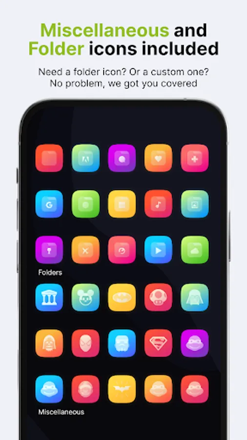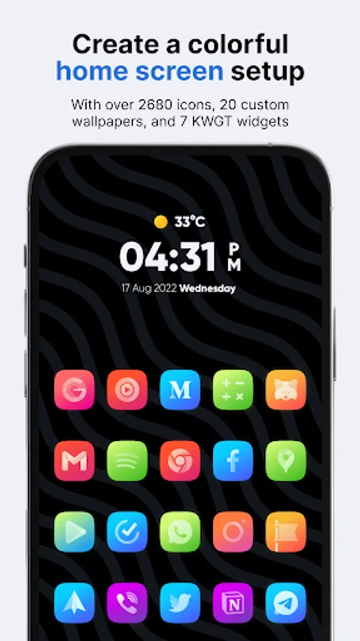 Athena icon pack has 2,690 icons, 20 custom wallpapers, and 7 KWGT widgets, so it’s all you need to personalize your phone how you like it. For the price of one app, you get content from three different apps. Athena icons combine solid and semi-transparent glyphs on top of the colorful gradient background, and the color palette is vibrant. It goes well with dark wallpapers. *To apply KWGT widgets, you need KWGT and KWGT Pro apps.