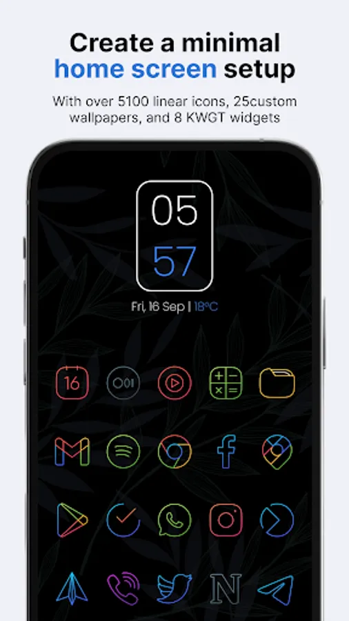 Let us introduce Vera Outline, our shapeless linear android icon pack—a unique and stylish collection of colorful outlined glyph icons perfect for any modern Android phone. With a focus on simplicity and elegance, these icons feature clean lines and a minimalist design that will elevate the look and feel of your homescreen and app drawer. The pack includes over 5,699 icons, 25 wallpapers, and 8 KWGT widgets to complete the look of your homescreen. For the price of one app, you get content from three different apps! Our shapeless Vera Outline icon pack will take your homescreen design to the next level!