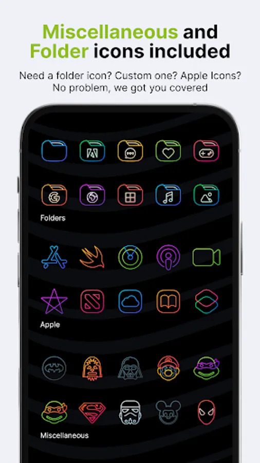 All our icon packs contain alternate icons for many popular apps, dynamic calendar icons, masking of unthemed icons, folders, and miscellaneous icons (you need to apply them manually).