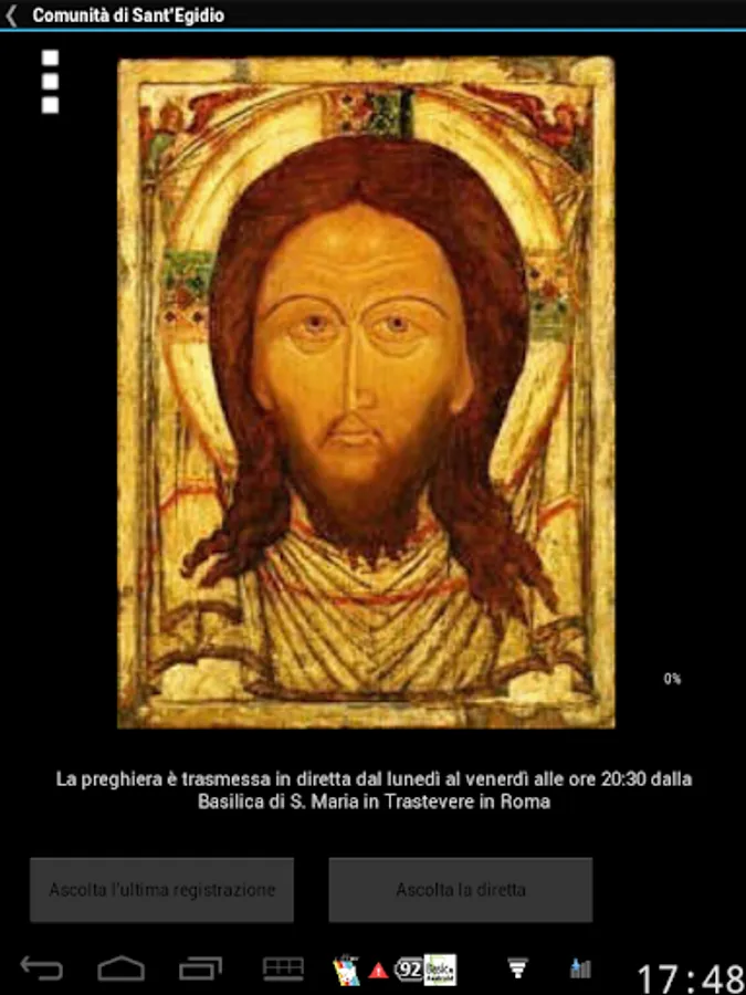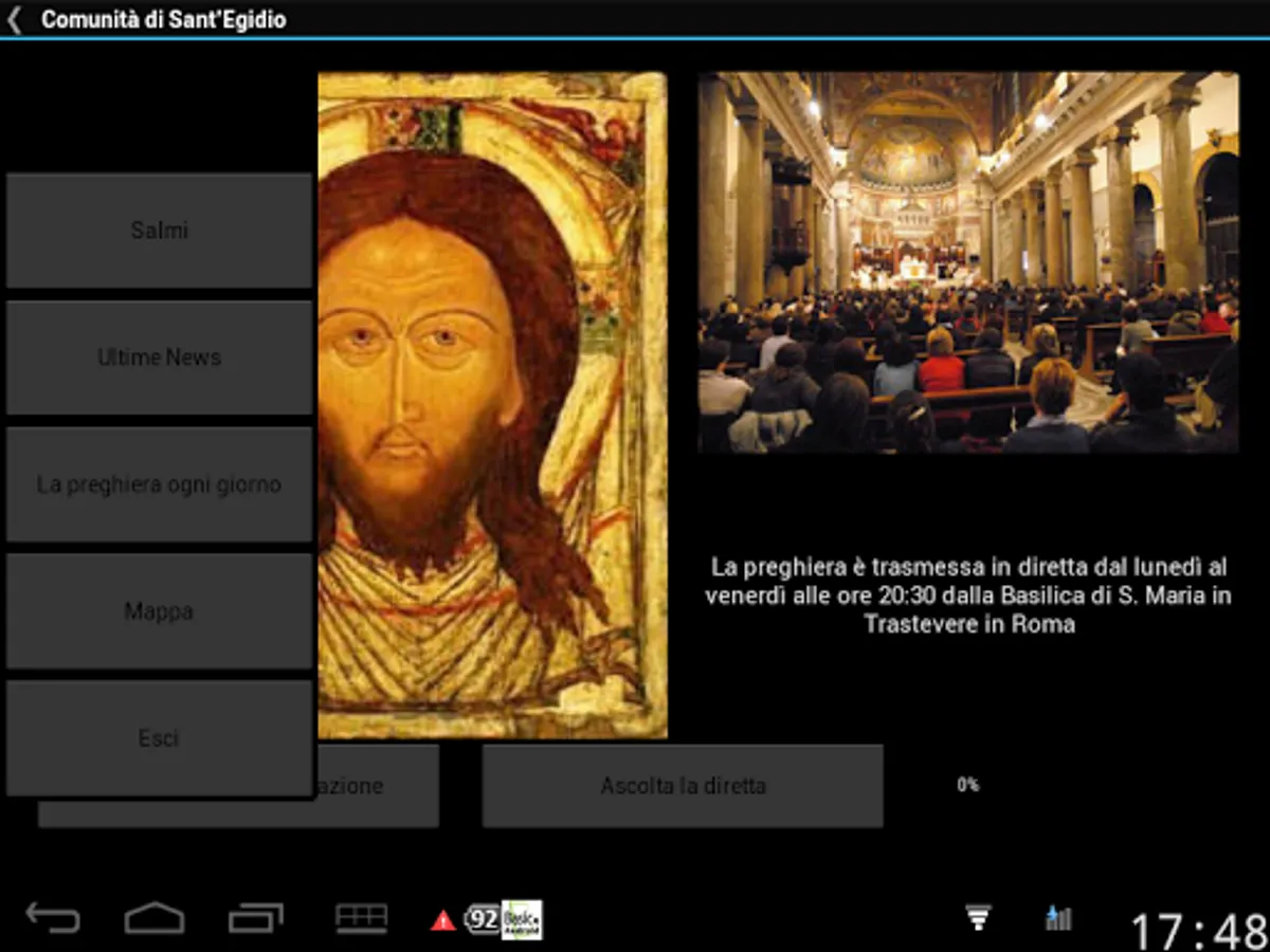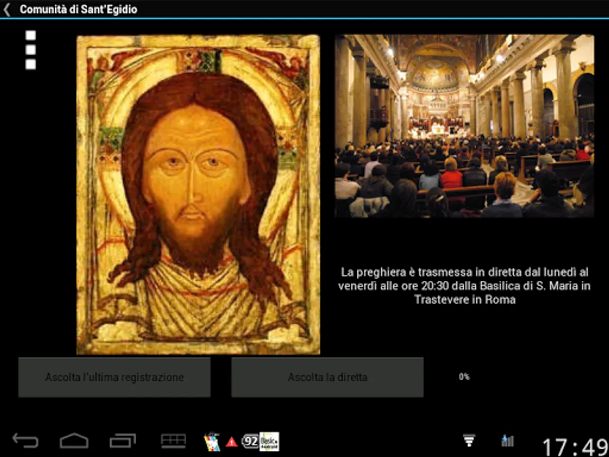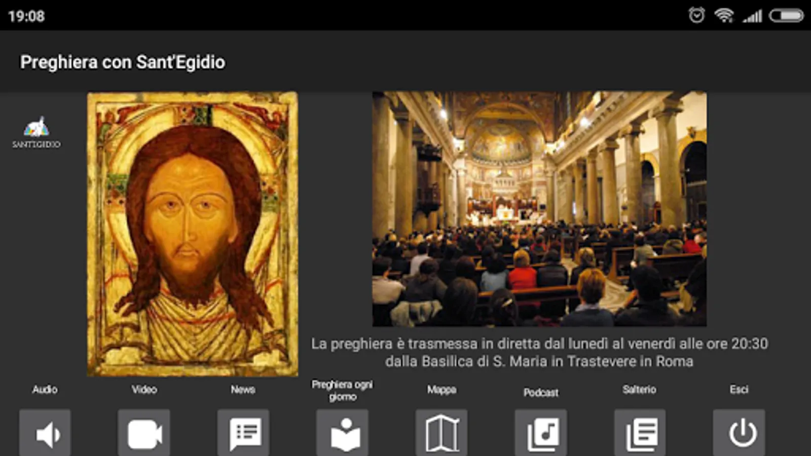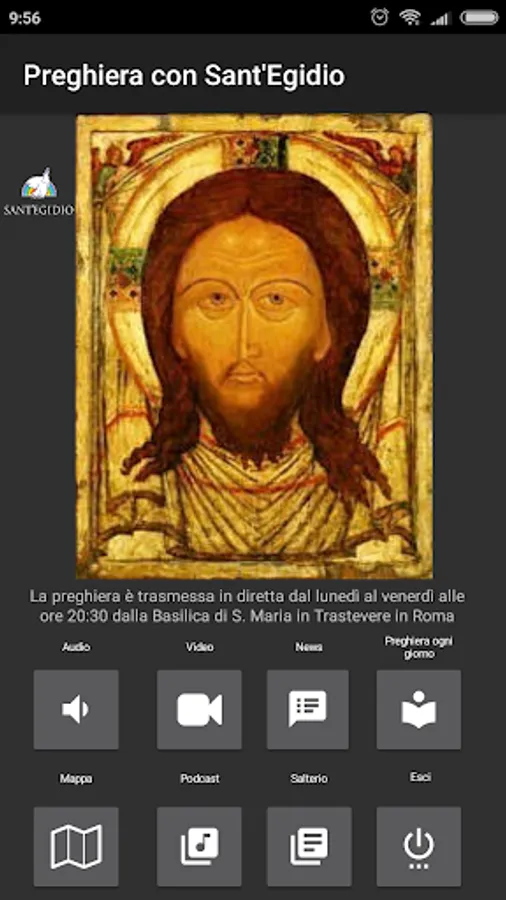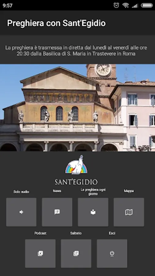 Every evening, from Monday to Friday, the Community of Sant'Egidio gathers in prayer in the basilica of Santa Maria in Trastevere in Rome. Through this application it is possible to follow the prayer live at 8 pm, from Monday to Friday or listen to the recordings of the last month. From the menu it is also possible to read the psalms, quickly access the latest news on the site www.santegidio.org, the page "Prayer every day" and the location of the Basilica of S. Maria in Trastevere on Google Maps.