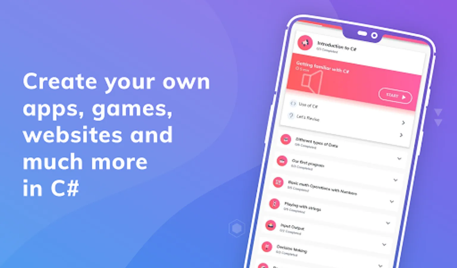 “Learn C#” app has a really simple and intuitive user interface. It is the best app to let you learn the C# programming language for free. So, what are you waiting for? Download the app now to become a C# Programming Pro.