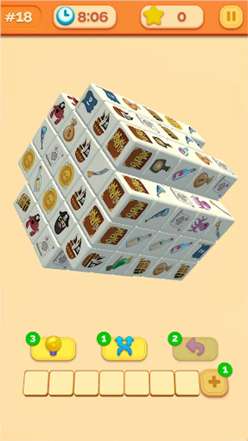 Your task is to rotate the 3D cube, find & match three identical tiles and clear the field!