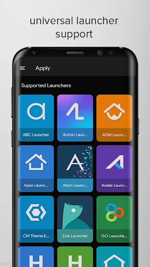 • Action • ADW • Apex • Atom • Aviate • CM Theme Engine • CPL • Evie • Go • Holo • Hyperion • Iconix • Lawnchair • LG Home • Lucid • M Launcher • Microsoft Launcher • Mini • Next • Nine • Nova Launcher • #Nova.Theme • OnePlus Launcher • Poco Launcher • Smart Launcher • Solo Launcher • Themer • TSF • ZenUI Launcher •