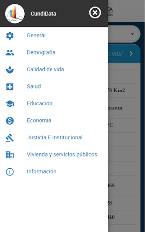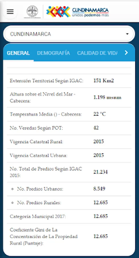 Cundidata is the first App developed by the Government of Cundinamarca, under the guidance of our Governor Jorge Emilio Rey, where you will find the figures and most important municipal indicators in population, education, health, quality of life, Justice, Economy, Housing and Public services. This tool is an input for decision-making at municipal and departmental levels, allowing Cundinamarca easy access to information and promoting knowledge of its territory.