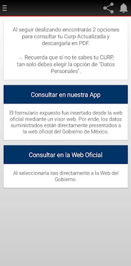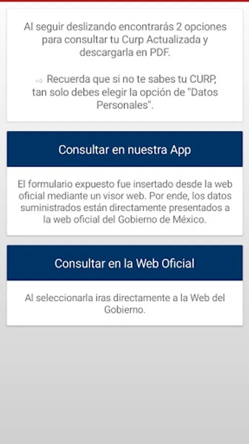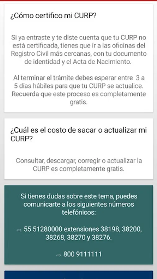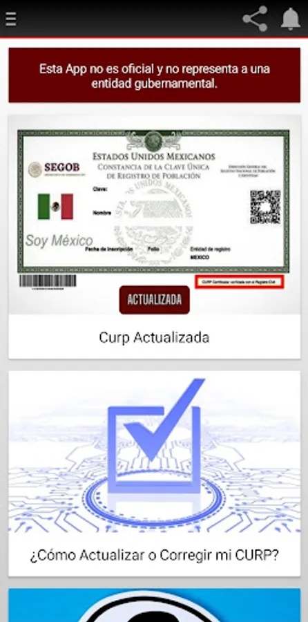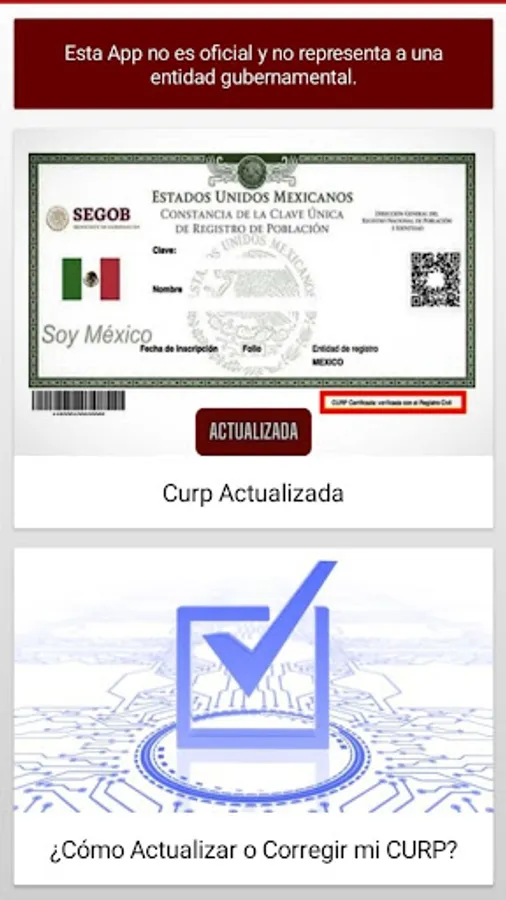 The Updated CURP application provides you with a quick and convenient solution to manage your Unique Population Registry Code. Access your CURP in a matter of seconds, either to check it online or download it directly to your device. In addition, we simplify the process by providing you with reliable information on how to correct your CURP in case of errors, and we guide you on how to verify if your CURP is officially certified.