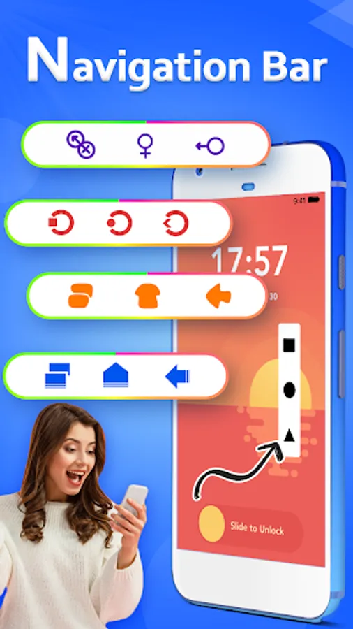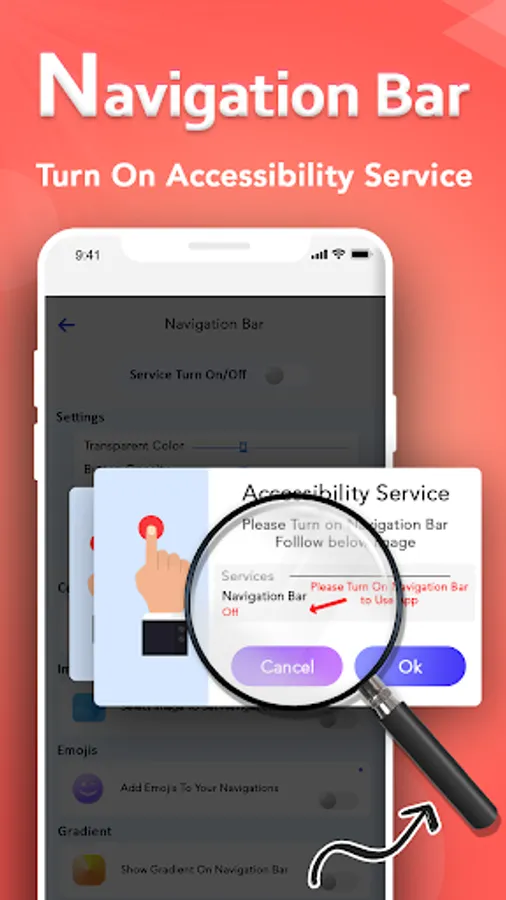 Custom Navigation Bar application provides several features and colors to make an awesome navigation bar. easy to swipe up and down navigation bar as assertive touch.it have also change your simple navigation bar into amazing emoji navigation bar.and one of the best advantages is you can also design your navigation bar with your favorite "Emoji".