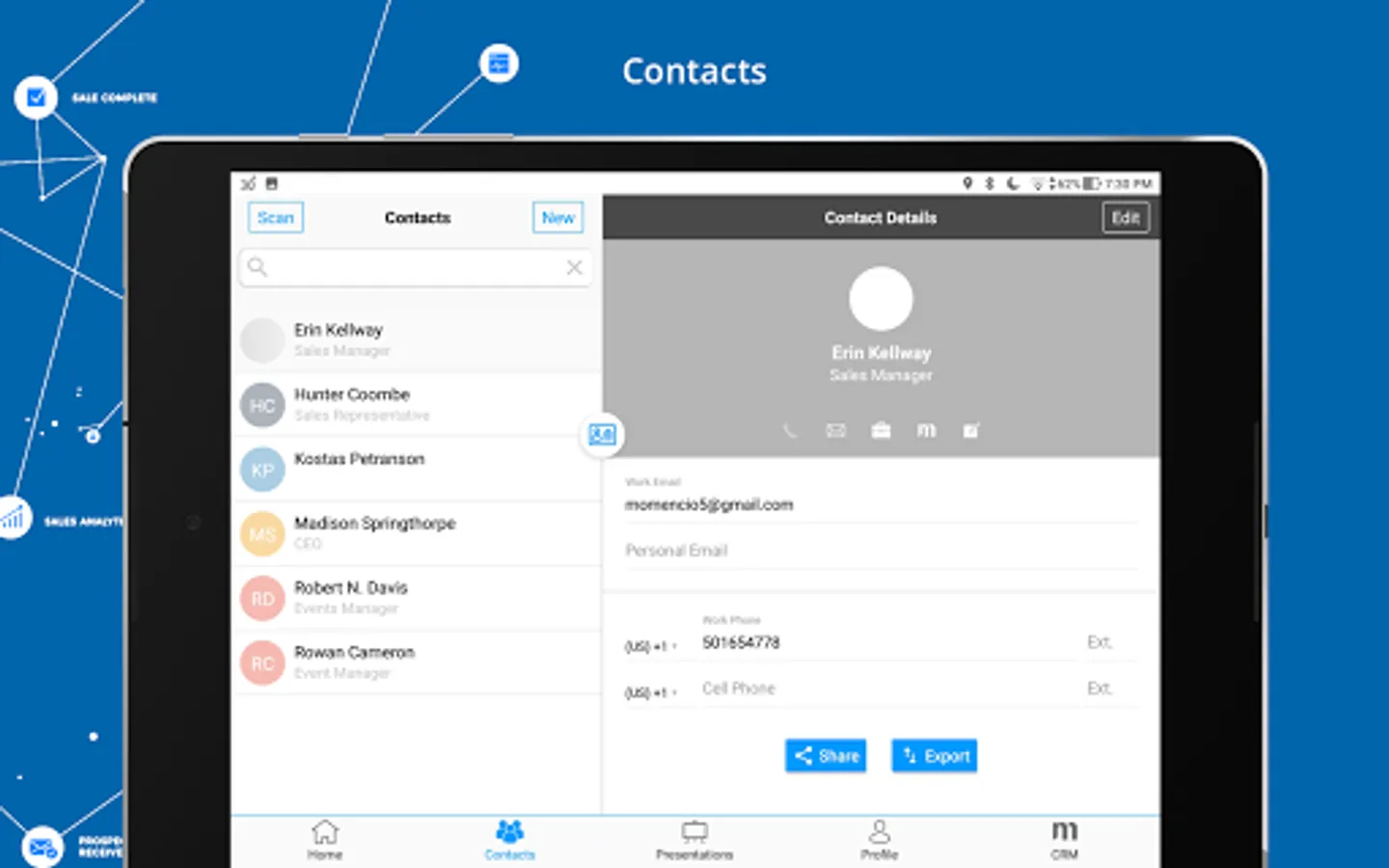 For Sales: Call existing contacts or create and call new prospects from the app. When your call is over, the duration will be logged and notes can be assigned for easy follow-up.
