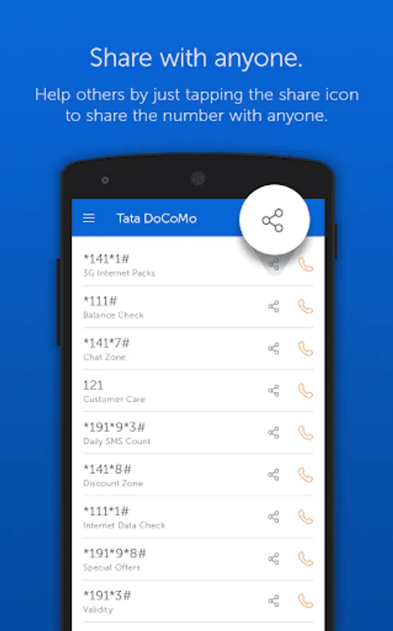 You can browse here, mobile network providers (Airtel, BSNL, Idea, Reliance, Tata, Vodafone) USSD codes for Balance Check, 2G Internet Balance, 3G Internet Balance, Recharge, Know Your Number, DND Service, SMS Packs, Net Packs, Special Packs, if you are looking to recharge your DTH (Airtel, Dish, Tata, Sun, Tata Sky) or you want to book a cab (OLA, Easy Cab, Meru, Quickcabs, Taxi for Sure or many more) or you wanna dial to your bank (Axis, Allahabad, Bank of Baroda, Canara Bank, Citibank, HDFC, IDBI, ICICI, PNB, SBI, Syndicate, Union) or any Railway enquiry, (DTC, DMRC) or Internet Provider (Tikona, Reliance) or Gas Provider (Bharat, HP, Indane) booking numbers, you'll get all phone number in one place or you need to connect your best shopping site (Amazon, Ebay, Flipkart, Home Shop 18, HealthKart, Jabong, Lenskart, Myntra, Only, Shoppers Stop, Zomato and many more)