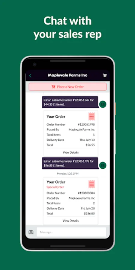 - Stay connected with your sales rep and the Maplevale team through in-app chat.