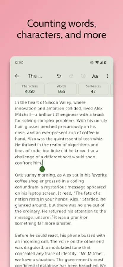 It's a Documents (Notes) app that instantly tallies your word count as you type. In addition to "Word count," it also provides counts for "Characters," "Sentences," "Lines," "Paragraphs," and "Bytes." This app is especially handy when you need to adhere to specific word or character limits, such as for reports, essays, columns, speech scripts, novels, and more.