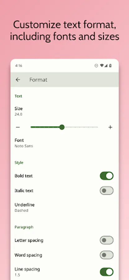 • Font: Noto Sans / Open Sans / Roboto / M PLUS 1 / Sawarabi Gothic / Hina Mincho / Klee One / Kaisei Decol / RocknRoll One / DotGothic16 / Zen Kurenaido / Oswald / Courier Prime / Red Rose