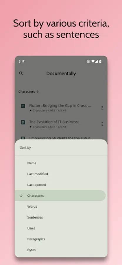• Sort by: Name / Last modified / Last opened / Characters / Words / Sentences / Lines / Paragraphs / Bytes