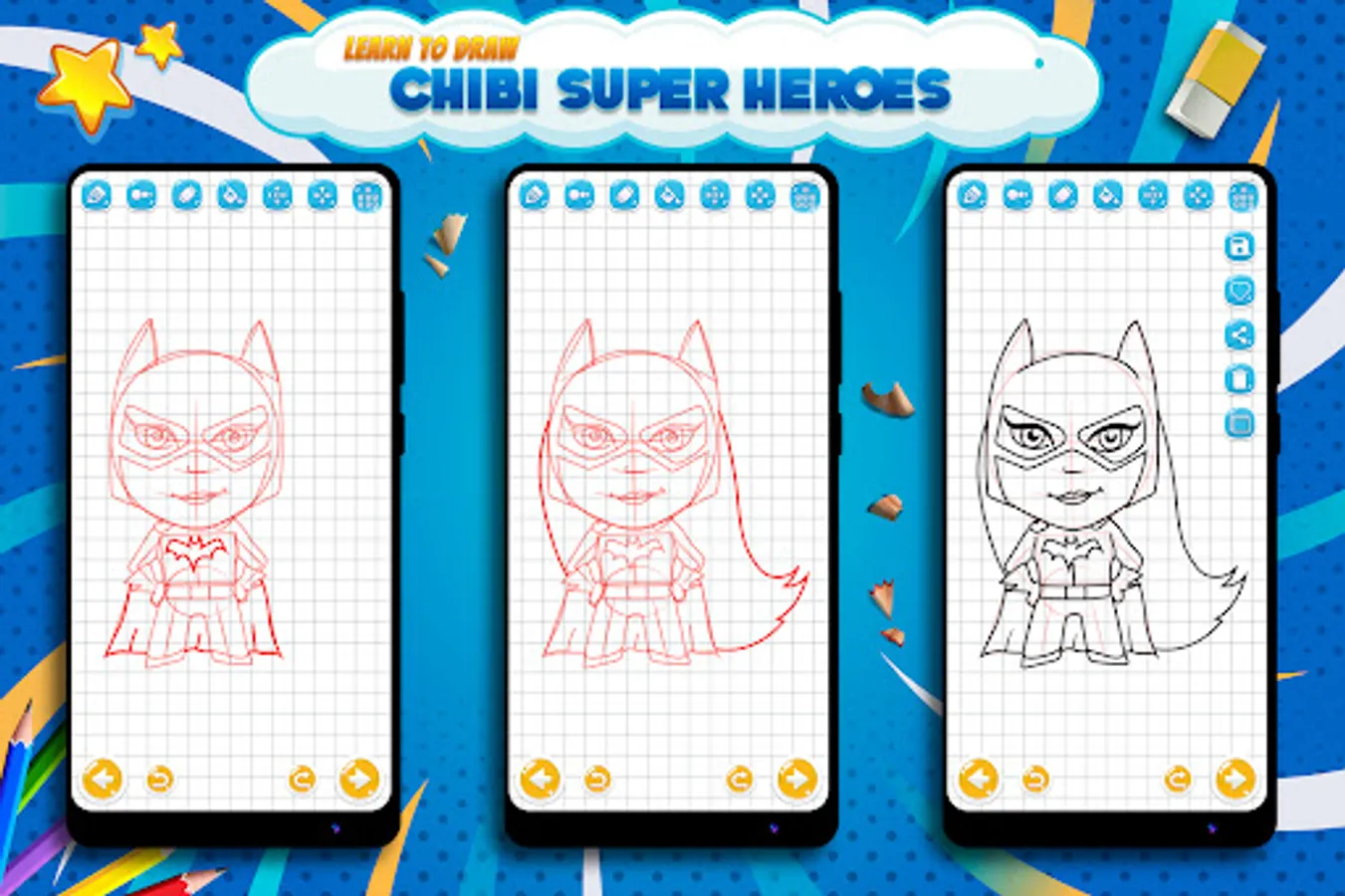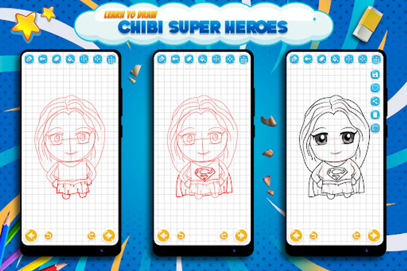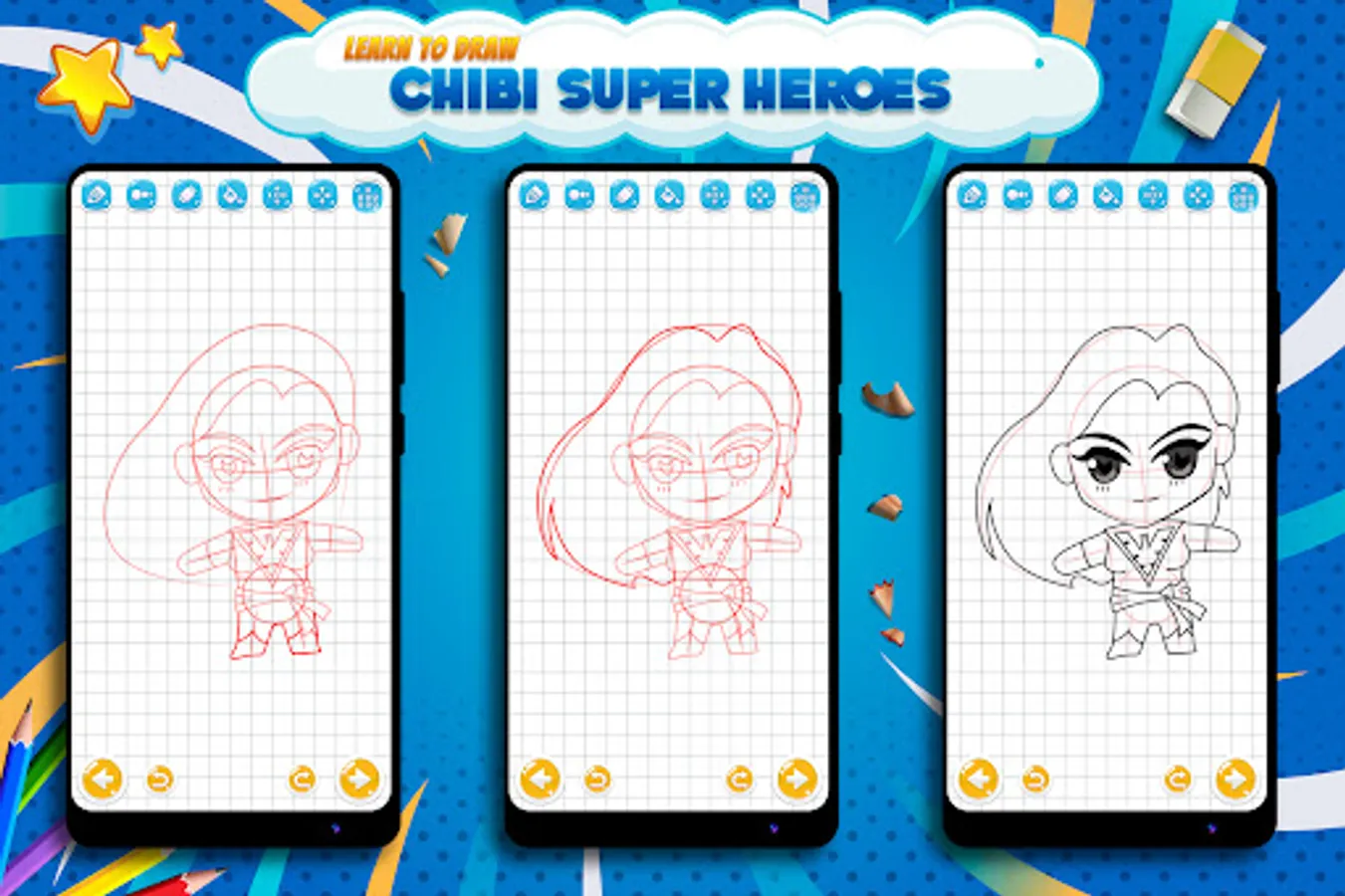 You don't need any special skills, just start drawing, be creative and impress your friends and family with your amazing skills by using this free Chibi Superhero Drawing Book App.