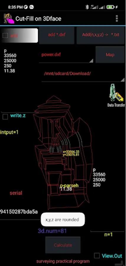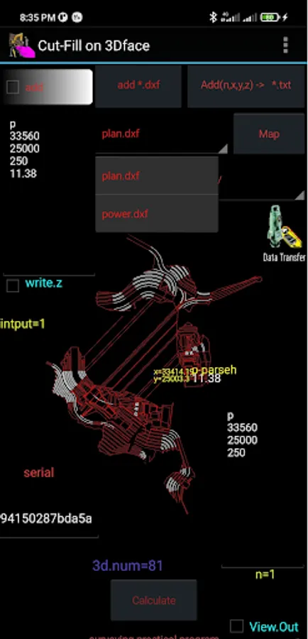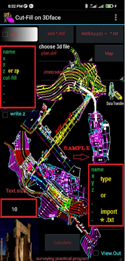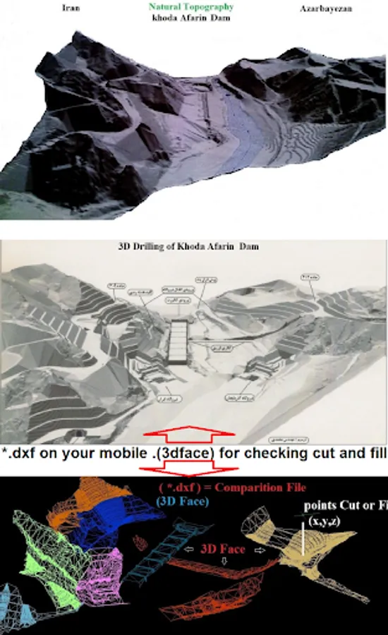 DTM cut fill surveying can receive line, point, Arc, 3dface from file.dxf There are one sample from dam .when you use this app then you don’t need map and expensive total station and you can calculate how much is cut or fill.