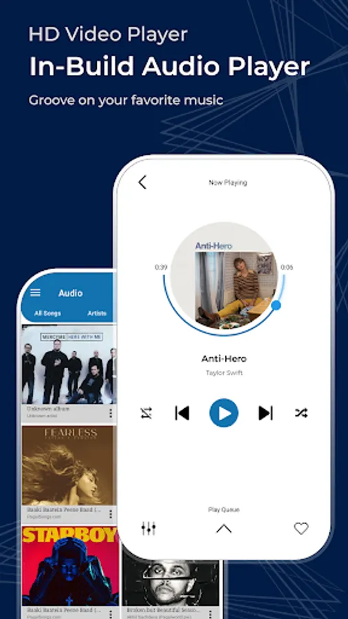 This free HD video player lets you download Bollywood movies, the latest music videos, trending web series, and play high-definition HD Videos for ALL video formats including MP4, MP3, MOV, MKV, FLV, M4V, and 3GP.