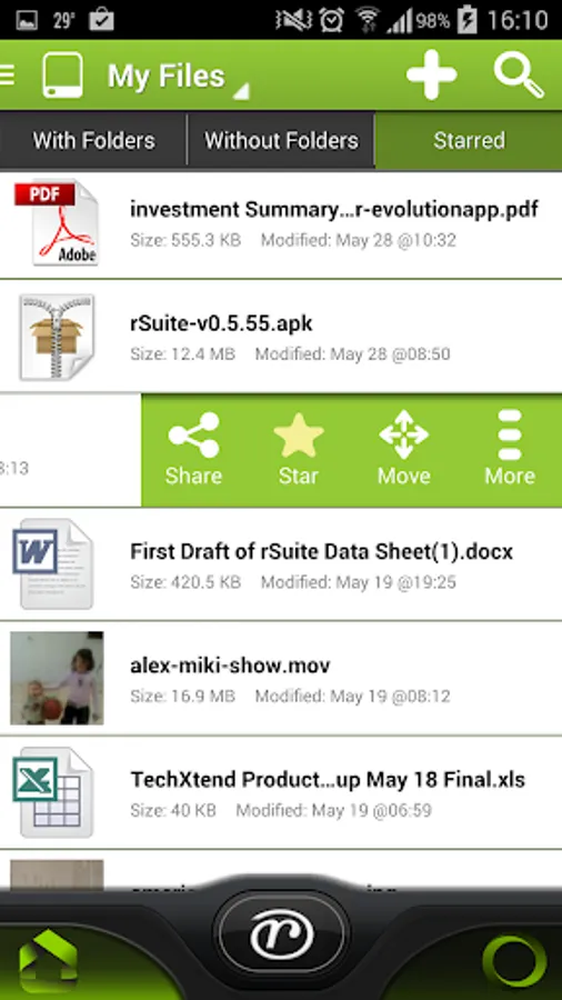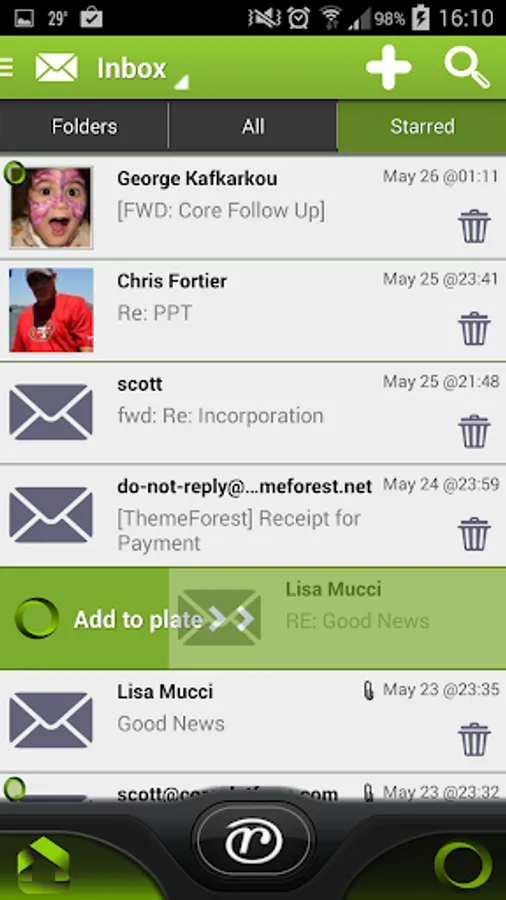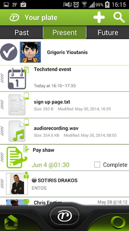 r-evolution app contains a unique data container called the plate. Any mail, document, contact etc. can be put on the plate by swiping right. The plate functions like a quick todo list and work management area. But additionally, on the plate, you can take actions by dragging or dropping data objects onto each other. For example, drag a mail on a person to forward it instantly, drag a document on a person to share it instantly, drag a document on a task then drag the task on a person to share the task with the document attached to it, etc.