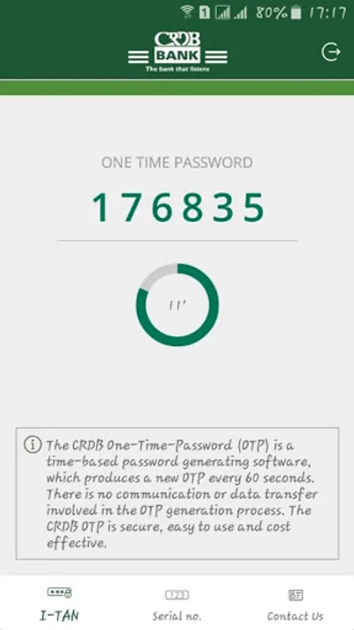 CRDB Burundi Omni Channels Mobile OTP is a time-based password generating software, which produces a new OTP every 60 seconds. There is no communication or data transfer involved in the OTP generation process. The CRDB OTP is secure , easy to use and cost effective