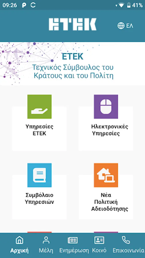 ETEK's mobile application "ETEK Mobile App" includes information on news, events, articles and publications as well as announcements, interventions and actions of ETEK on technical issues that concern the scientific community and society at large. The application also includes information on Services that ETEK provides to its members and citizens as well as access to ETEK's Online Services.