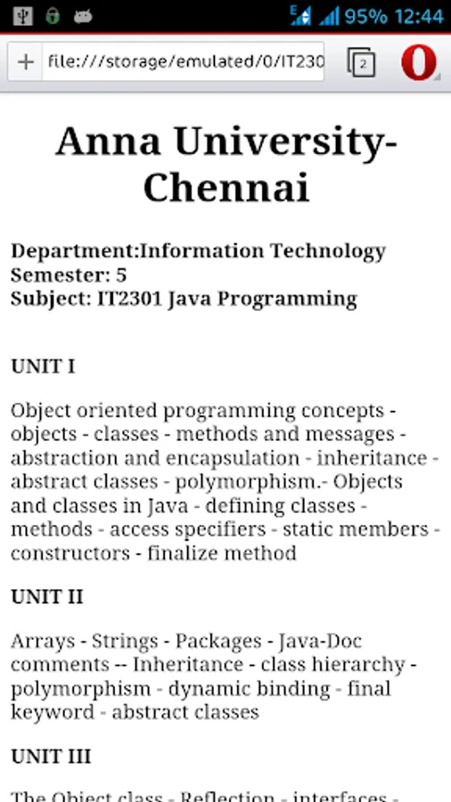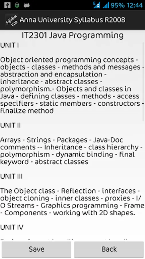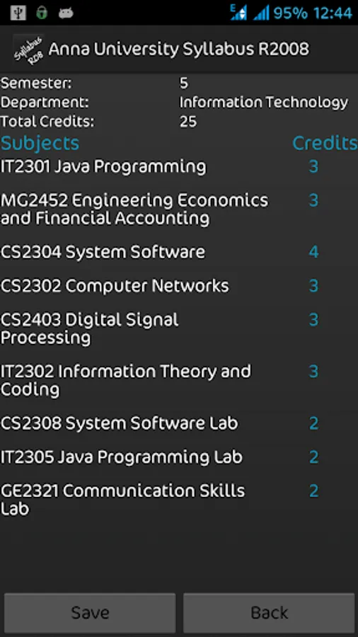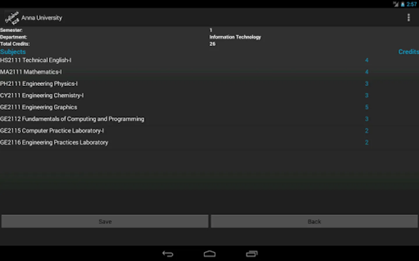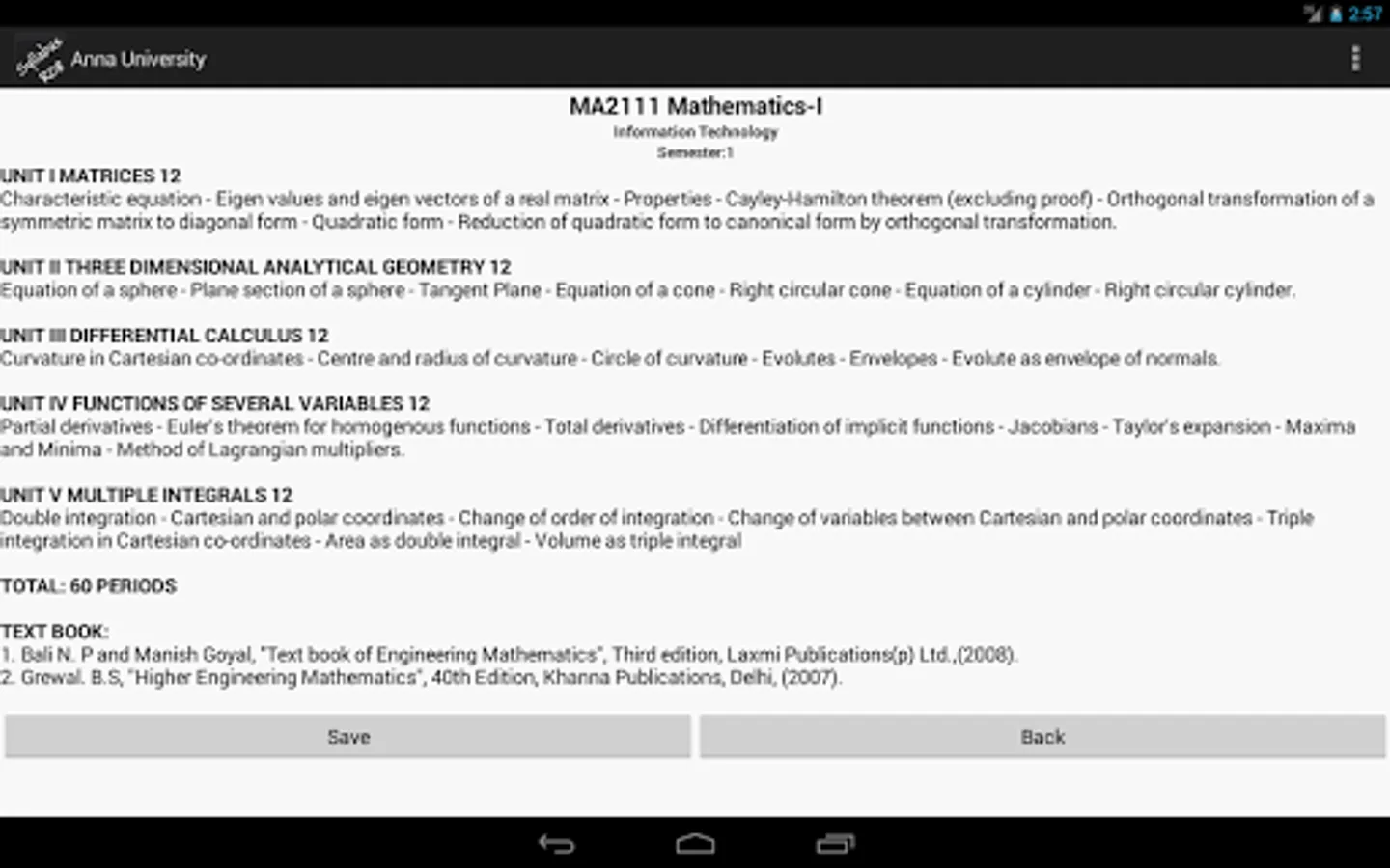 By using this application you can save the Syllabus as HTML file to print it. This will helpful,if your professor asked you to do that. Currently 2 semesters of all departments was included. Soon I will add the remaining semesters.