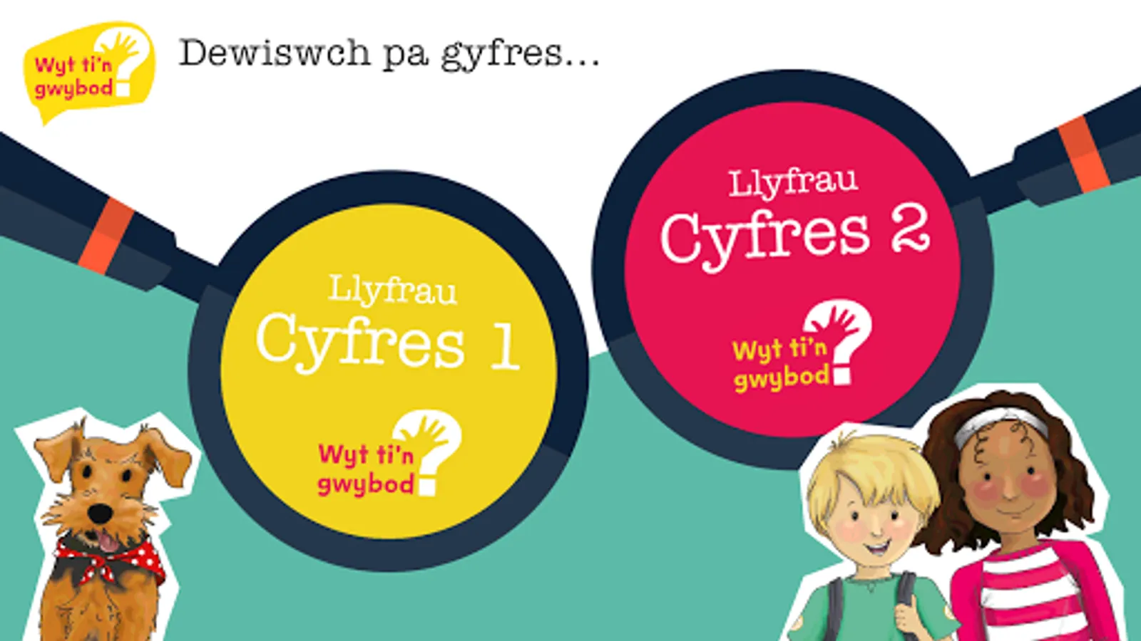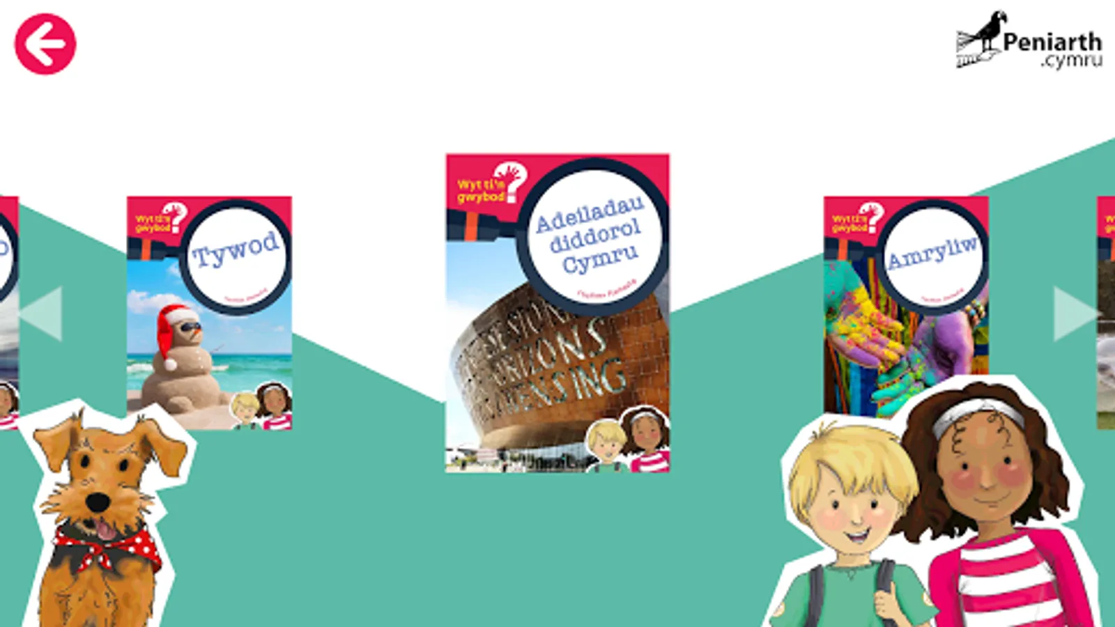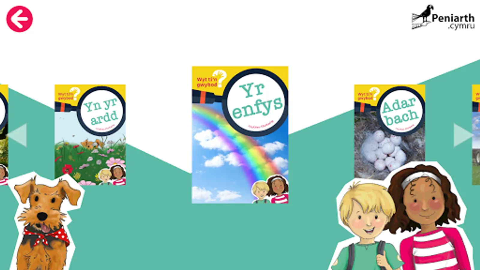 The Wyt ti'n gwybod app serves as a companion to the book series of the same name. Within this app you can read each of the 30 books available, with 15 books contained in each of the app's two levels. As a guide, the yellow level contains books for 3 - 5 year olds, and the red level contains books for 5 - 7 year olds.