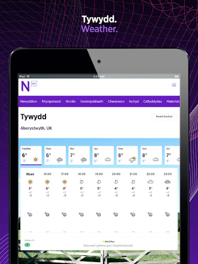 This is the only online weather service in Welsh in partnership with the Met Office. You can see the weather in your area, by day and by the hour; as well as the forecast for the week.