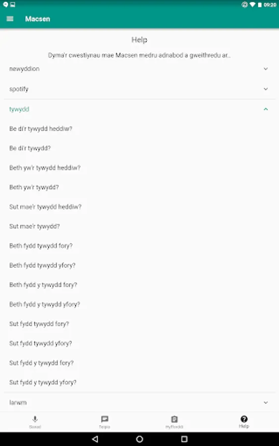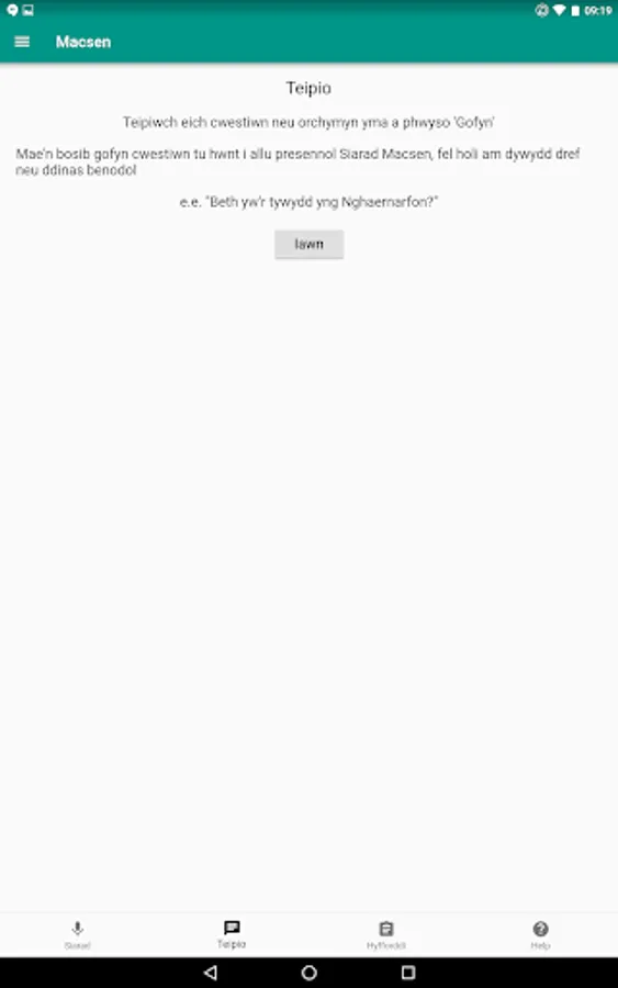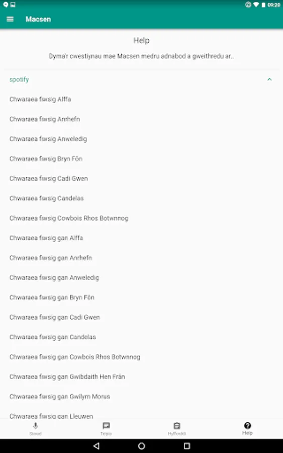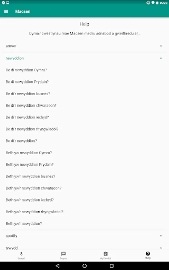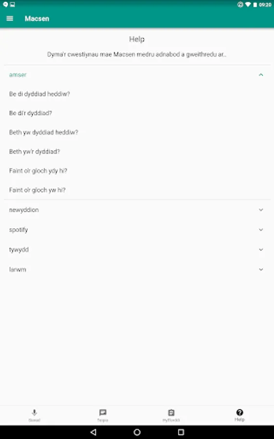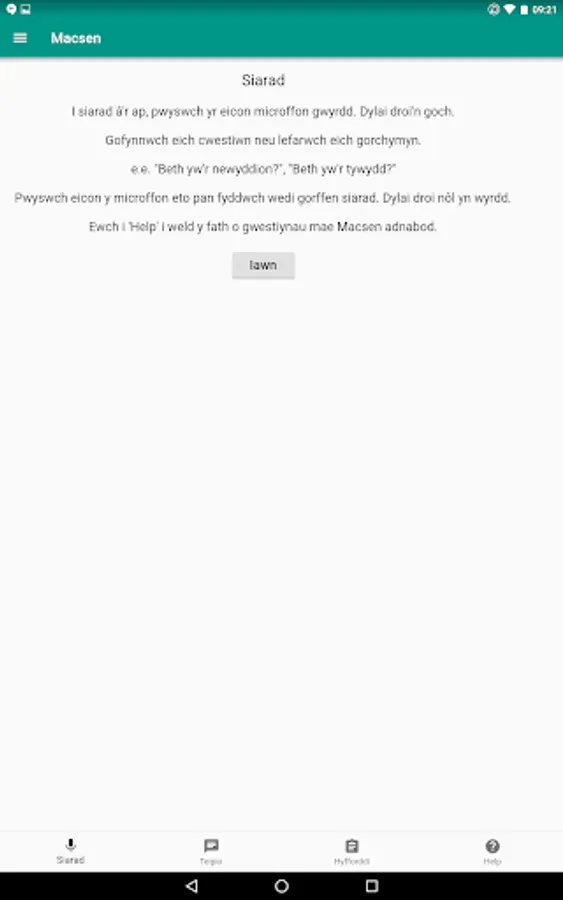 Macsen is a Welsh language voice assistant for your Android device. You can use voice commands or spoken questions to play music by Welsh artists on your Spotify app, hear the latest news from Welsh language news providers (Golwg360), ask questions from Wicipedia, play certain television programs on S4C Clic or simply set an alarm, and ask for the time or weather. : Mae Macsen yn gynorthwyydd lleferydd Cymraeg ar gyfer eich dyfais Android. Gallwch roi gorchmynion neu ofyn cwestiynau ar lafar er mwyn chwarae cerddoriaeth Gymraeg ar eich ap Spotify, clywed y newyddion diweddaraf gan ddarparwyr newyddion Cymraeg (Golwg360), gofyn cwestiynau i Wicipedia, chwarae rhai rhaglenni teledu ar S4C Clic neu yn syml osod larwm, a gofyn am yr amser neu'r tywydd.